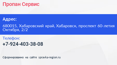 Пропан-Сервис по адресу 680015, Хабаровский край, Хабаровск, проспект 60-летия Октября, 2/2 в дальнейшем Организация, размещена в следующих категориях: