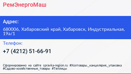 РемЭнергоМаш по адресу 680006, Хабаровский край, Хабаровск, Индустриальная, 19а/1 в дальнейшем Организация, размещена в следующих категориях: