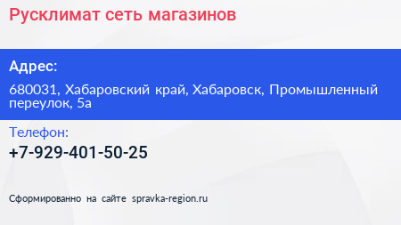Русклимат, сеть магазинов по адресу 680031, Хабаровский край, Хабаровск, Промышленный переулок, 5а в дальнейшем Организация, размещена в следующих категориях: