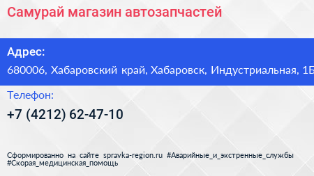 Самурай, магазин автозапчастей по адресу 680006, Хабаровский край, Хабаровск, Индустриальная, 1Б в дальнейшем Организация, размещена в следующих категориях:
