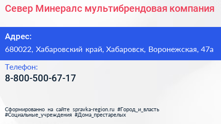 Север Минералс, мультибрендовая компания по адресу 680022, Хабаровский край, Хабаровск, Воронежская, 47а в дальнейшем Организация, размещена в следующих категориях: