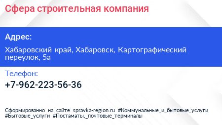 Сфера, строительная компания по адресу Хабаровский край, Хабаровск, Картографический переулок, 5а в дальнейшем Организация, размещена в следующих категориях: