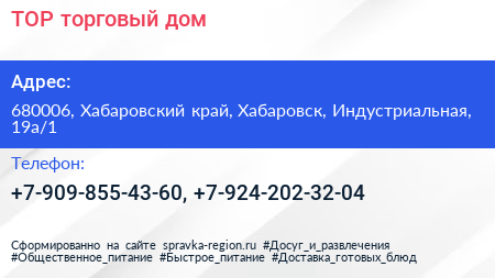 ТОР, торговый дом по адресу 680006, Хабаровский край, Хабаровск, Индустриальная, 19а/1 в дальнейшем Организация, размещена в следующих категориях:
