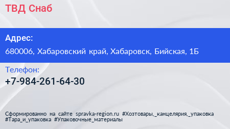 ТВД Снаб по адресу 680006, Хабаровский край, Хабаровск, Бийская, 1Б в дальнейшем Организация, размещена в следующих категориях: