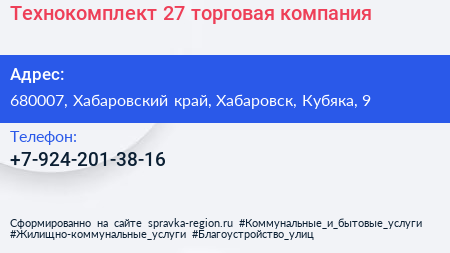 Технокомплект 27, торговая компания по адресу 680007, Хабаровский край, Хабаровск, Кубяка, 9 в дальнейшем Организация, размещена в следующих категориях: