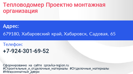 Тепловодомер, Проектно-монтажная организация по адресу 679180, Хабаровский край, Хабаровск, Садовая, 65 в дальнейшем Организация, размещена в следующих категориях: