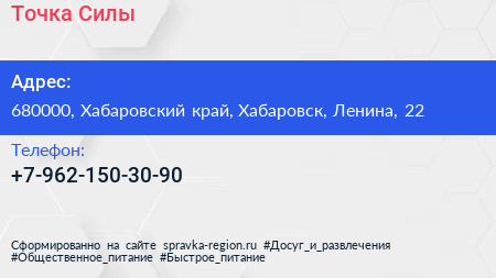 Точка Силы по адресу 680000, Хабаровский край, Хабаровск, Ленина, 22 в дальнейшем Организация, размещена в следующих категориях:
