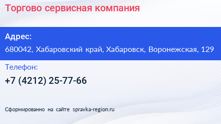 Торгово-сервисная компания по адресу 680042, Хабаровский край, Хабаровск, Воронежская, 129 в дальнейшем Организация, размещена в следующих категориях:
