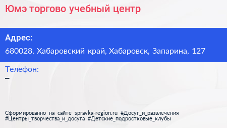 Юмэ, торгово-учебный центр по адресу 680028, Хабаровский край, Хабаровск, Запарина, 127 в дальнейшем Организация, размещена в следующих категориях: