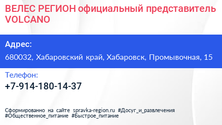 ВЕЛЕС-РЕГИОН, официальный представитель VOLCANO по адресу 680032, Хабаровский край, Хабаровск, Промывочная, 15 в дальнейшем Организация, размещена в следующих категориях: