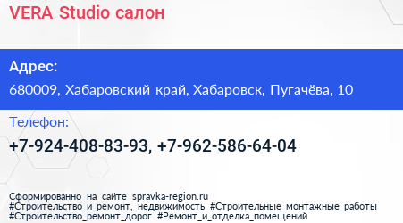 VERA Studio, салон по адресу 680009, Хабаровский край, Хабаровск, Пугачёва, 10 в дальнейшем Организация, размещена в следующих категориях: