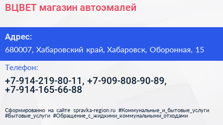 ВЦВЕТ, магазин автоэмалей по адресу 680007, Хабаровский край, Хабаровск, Оборонная, 15 в дальнейшем Организация, размещена в следующих категориях:
