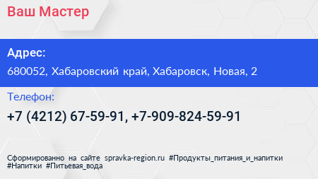 Ваш Мастер по адресу 680052, Хабаровский край, Хабаровск, Новая, 2 в дальнейшем Организация, размещена в следующих категориях: