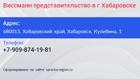 Виссманн, представительство в г. Хабаровске по адресу 680013, Хабаровский край, Хабаровск, Кулибина, 1 в дальнейшем Организация, размещена в следующих категориях: