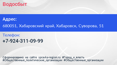 Водосбыт по адресу 680051, Хабаровский край, Хабаровск, Суворова, 51 в дальнейшем Организация, размещена в следующих категориях: