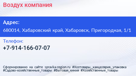 Воздух, компания по адресу 680014, Хабаровский край, Хабаровск, Пригородная, 1/1 в дальнейшем Организация, размещена в следующих категориях: