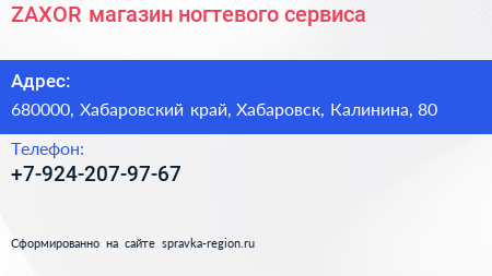 ZAXOR, магазин ногтевого сервиса по адресу 680000, Хабаровский край, Хабаровск, Калинина, 80 в дальнейшем Организация, размещена в следующих категориях: