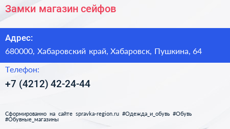 Замки, магазин сейфов по адресу 680000, Хабаровский край, Хабаровск, Пушкина, 64 в дальнейшем Организация, размещена в следующих категориях: