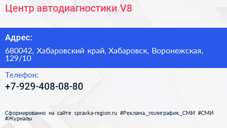 Центр автодиагностики V8 по адресу 680042, Хабаровский край, Хабаровск, Воронежская, 129/10 в дальнейшем Организация, размещена в следующих категориях: