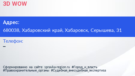 3D-WOW по адресу 680038, Хабаровский край, Хабаровск, Серышева, 31 в дальнейшем Организация, размещена в следующих категориях: