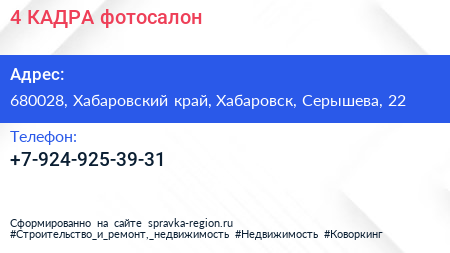 4 КАДРА, фотосалон по адресу 680028, Хабаровский край, Хабаровск, Серышева, 22 в дальнейшем Организация, размещена в следующих категориях:
