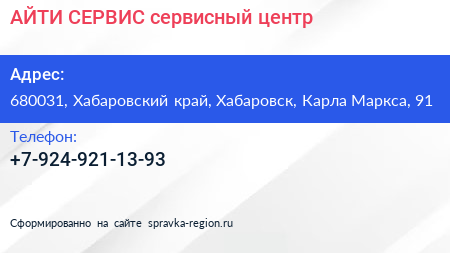 АЙТИ-СЕРВИС, сервисный центр по адресу 680031, Хабаровский край, Хабаровск, Карла Маркса, 91 в дальнейшем Организация, размещена в следующих категориях:
