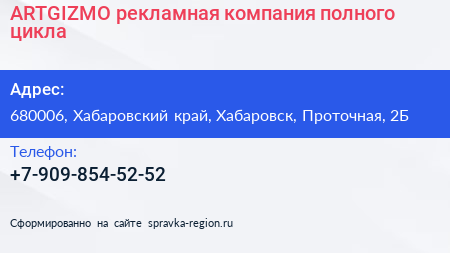 ARTGIZMO, рекламная компания полного цикла по адресу 680006, Хабаровский край, Хабаровск, Проточная, 2Б в дальнейшем Организация, размещена в следующих категориях: