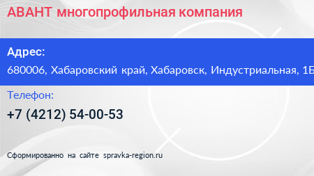 АВАНТ, многопрофильная компания по адресу 680006, Хабаровский край, Хабаровск, Индустриальная, 1Б в дальнейшем Организация, размещена в следующих категориях: