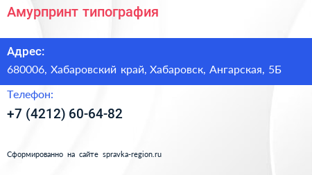 Амурпринт, типография по адресу 680006, Хабаровский край, Хабаровск, Ангарская, 5Б в дальнейшем Организация, размещена в следующих категориях: