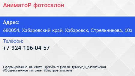 АниматоР, фотосалон по адресу 680054, Хабаровский край, Хабаровск, Стрельникова, 10а в дальнейшем Организация, размещена в следующих категориях: