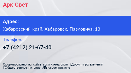 Арк Свет по адресу Хабаровский край, Хабаровск, Павловича, 13 в дальнейшем Организация, размещена в следующих категориях: