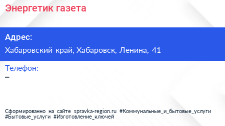 Энергетик, газета по адресу Хабаровский край, Хабаровск, Ленина, 41 в дальнейшем Организация, размещена в следующих категориях: