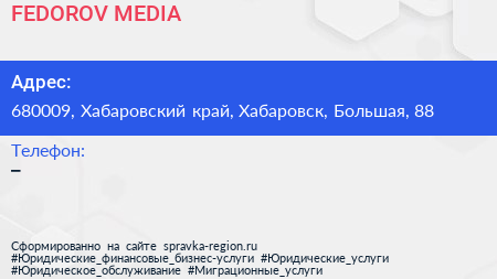 FEDOROV MEDIA по адресу 680009, Хабаровский край, Хабаровск, Большая, 88 в дальнейшем Организация, размещена в следующих категориях:
