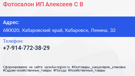 Фотосалон, ИП Алексеев С.В. по адресу 680020, Хабаровский край, Хабаровск, Ленина, 32 в дальнейшем Организация, размещена в следующих категориях: