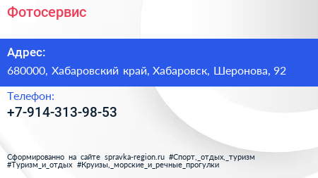 Фотосервис по адресу 680000, Хабаровский край, Хабаровск, Шеронова, 92 в дальнейшем Организация, размещена в следующих категориях: