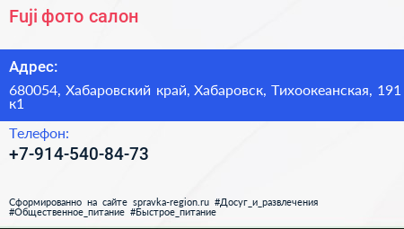 Fuji-фото, салон по адресу 680054, Хабаровский край, Хабаровск, Тихоокеанская, 191 к1 в дальнейшем Организация, размещена в следующих категориях: