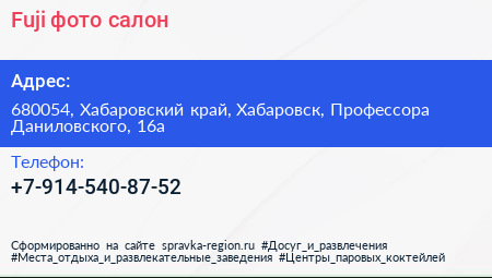 Fuji-фото, салон по адресу 680054, Хабаровский край, Хабаровск, Профессора Даниловского, 16а в дальнейшем Организация, размещена в следующих категориях: