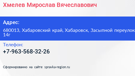 Хмелев Мирослав Вячеславович по адресу 680013, Хабаровский край, Хабаровск, Засыпной переулок, 14г в дальнейшем Организация, размещена в следующих категориях: