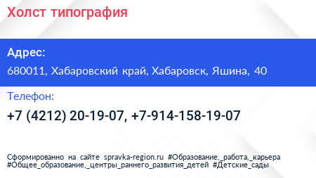 Холст, типография по адресу 680011, Хабаровский край, Хабаровск, Яшина, 40 в дальнейшем Организация, размещена в следующих категориях: