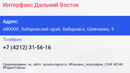 Интерфакс Дальний Восток по адресу 680000, Хабаровский край, Хабаровск, Шевченко, 9 в дальнейшем Организация, размещена в следующих категориях: