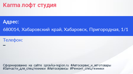 Karma, лофт-студия по адресу 680014, Хабаровский край, Хабаровск, Пригородная, 1/1 в дальнейшем Организация, размещена в следующих категориях: