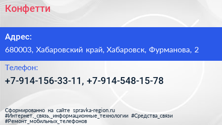 Конфетти по адресу 680003, Хабаровский край, Хабаровск, Фурманова, 2 в дальнейшем Организация, размещена в следующих категориях: