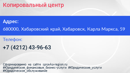 Копировальный центр по адресу 680000, Хабаровский край, Хабаровск, Карла Маркса, 59 в дальнейшем Организация, размещена в следующих категориях: