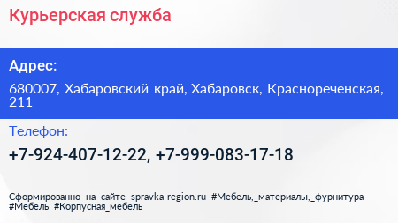 Курьерская служба по адресу 680007, Хабаровский край, Хабаровск, Краснореченская, 211 в дальнейшем Организация, размещена в следующих категориях: