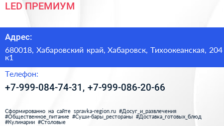 LED-ПРЕМИУМ по адресу 680018, Хабаровский край, Хабаровск, Тихоокеанская, 204 к1 в дальнейшем Организация, размещена в следующих категориях: