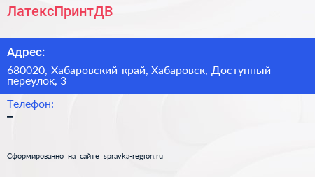 ЛатексПринтДВ по адресу 680020, Хабаровский край, Хабаровск, Доступный переулок, 3 в дальнейшем Организация, размещена в следующих категориях:
