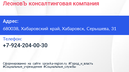 ЛеоновЪ, консалтинговая компания по адресу 680038, Хабаровский край, Хабаровск, Серышева, 31 в дальнейшем Организация, размещена в следующих категориях:
