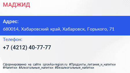 МАДЖИД по адресу 680014, Хабаровский край, Хабаровск, Горького, 71 в дальнейшем Организация, размещена в следующих категориях: