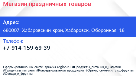 Магазин праздничных товаров по адресу 680007, Хабаровский край, Хабаровск, Оборонная, 18 в дальнейшем Организация, размещена в следующих категориях: