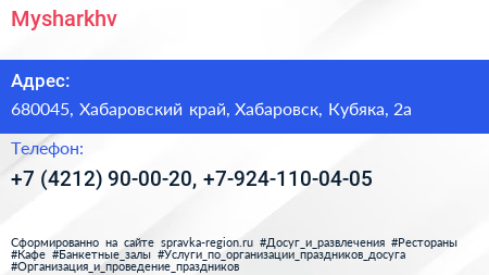 Mysharkhv по адресу 680045, Хабаровский край, Хабаровск, Кубяка, 2а в дальнейшем Организация, размещена в следующих категориях: